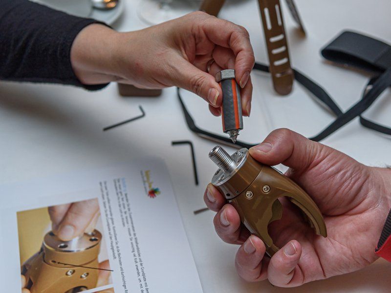 The basic idea goes back to a project from the USA. This basic variant was refined as part of TheHandProject, improved functionality was achieved with new materials, a different production process enables higher quality of the individual parts and various other in-house developments improve the possible uses and acceptance by the recipients. In addition, the actual prosthesis was supplemented with additional elements such as the elbow, the cosmetic hand and the thermoplastic material, making it much more functional and helpful for the recipients.